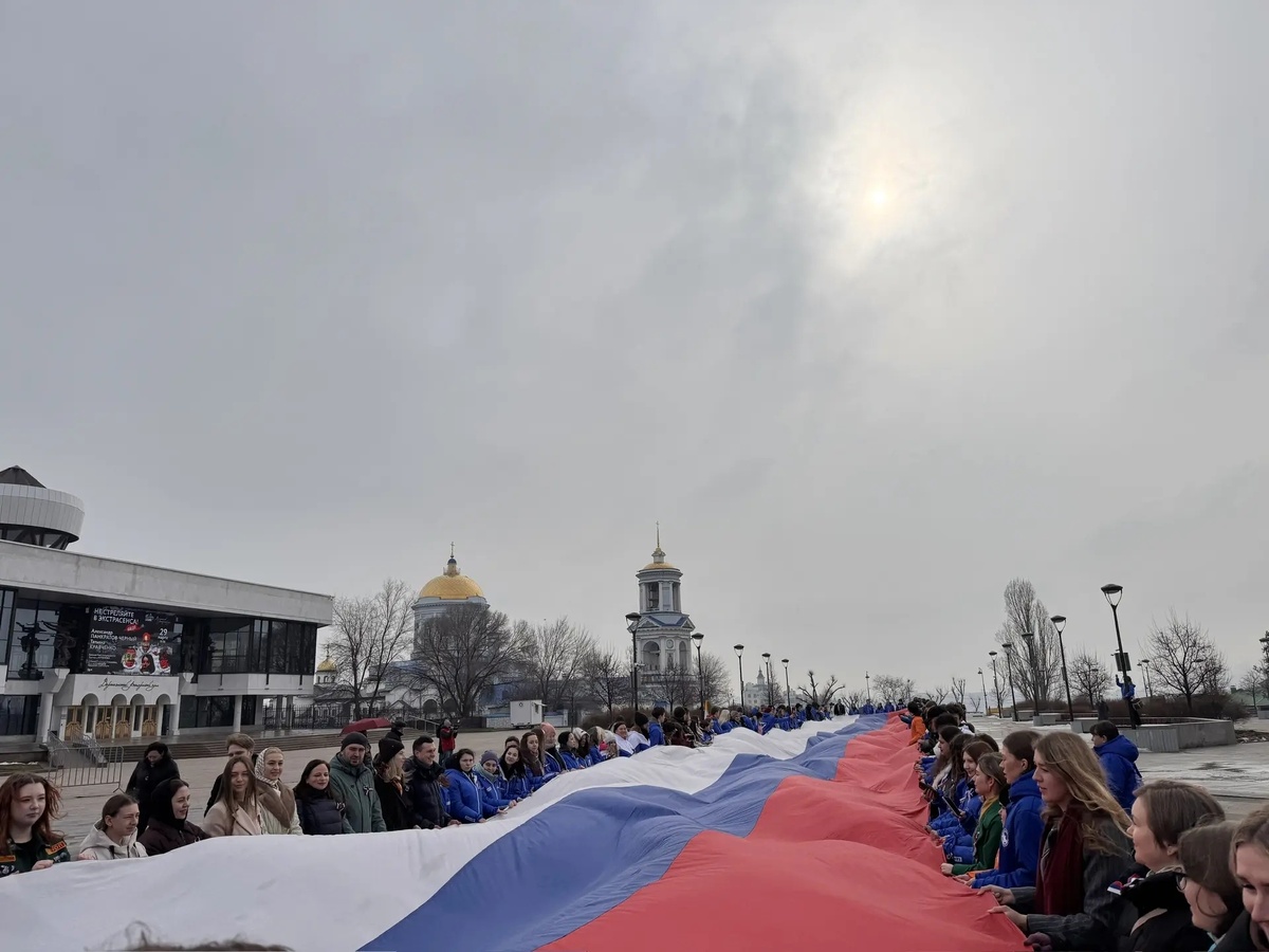 Сотрудники Управления Росреестра по Воронежской области вместе с сотнями горожан вышли на Советскую площадь, чтобы отметить 12-ю годовщину воссоединения Крыма с Россией. Собравшиеся развернули 60-метровый российский триколор.