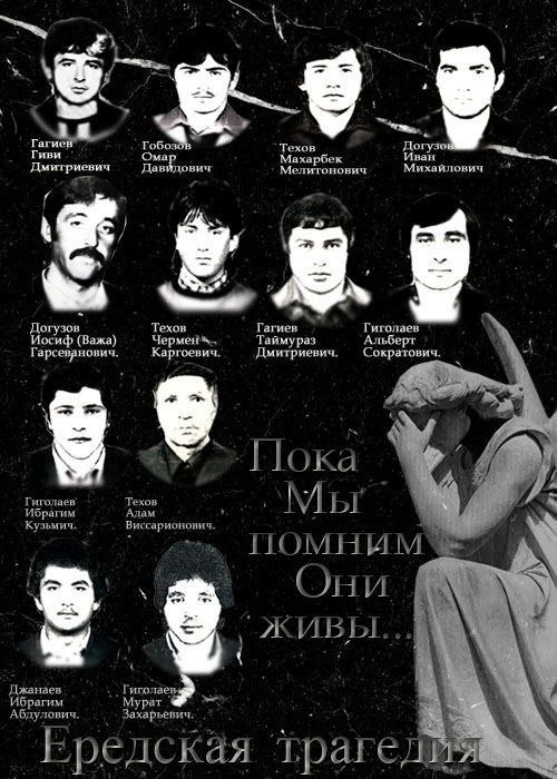 18 марта 1991 г. грузинские формирования зверски запытали и убили в селении Еред 12 жителей Южной Осетии, единственная вина которых заключалась в их неправильной, с точки зрения грузин, национальности. Часть убитых, как выяснилось после, была похоронена заживо. Старшему из них было 67 лет, младшему — 19. Список жертв: • Техов Адам • Техов Махар • Техов Чермен • Гагиев Таймураз • Гагиев Павел • Гиголаев Ибрагим • Гиголаев Альберт • Гиголаев Мурат • Гобозов Омар • Догузов Иван • Догузов Важа • Джанаев Иван Машина, с которой грузины высадили в Ереде 25 человек, была «Уралом», принадлежавшим ВВ СССР. Союз пока не развалился, и люди по-прежнему верили в то, что всё образуется. «Военная» машина казалась им гарантией безопасности. Тела убитых были эксгумированы спустя почти три года. Еред — большое селение в непосредственной близости от Цхинвала, но его жители, прекрасно знавшие, что случилось с 12 осетинами и где их закопали, отказывались даже указывать место захоронения, пока кто-то, н