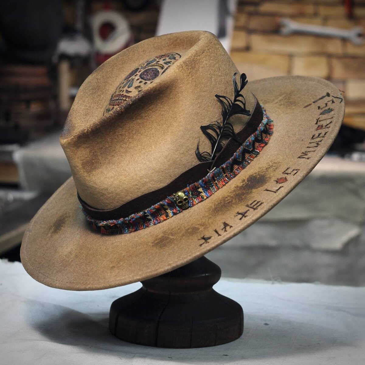 » Поменяли название этой модели, следуя новым правилам. И если не всем словам можно найти точную замену на русском — особенно когда речь о героях культурных традиций других стран, — то в честь Ла Катрины назвать можно и нужно. Ла Катрина (La Catrina) — дама-скелет в элегантной шляпе, символ мексиканского праздника День мёртвых. Но на нашей шляпе — не она. Мы нарисовали сахарный череп. Сахарные черепа, сделанные из сахара и украшенные яркой глазурью, символизируют сладкую и хрупкую природу жизни. Их ставят на алтари — чтобы души умерших могли порадоваться угощению. Бежевый фетр с градиентом в темноту. Две ленты на тулье: одна — из потертой замши, в цветах песка и коры, другая — яркая, этническая, с переливами праздника. На тулье — сахарный череп, расписанный вручную. А на полях — надпись Día de los Muertos, где каждая буква сложена из маленьких косточек. В Мексике верят: в День мёртвых души возвращаются домой. Эта шляпа — про память, которая становится праздником. Про то, что всё