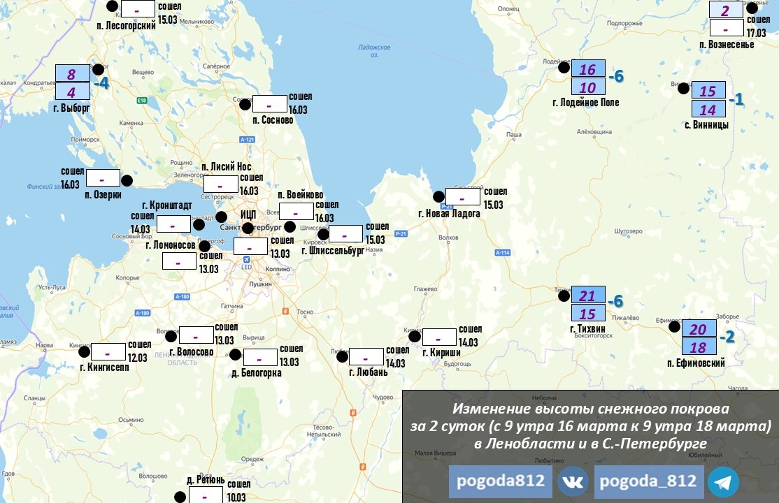 ☀📈 Снежный покров за двое минувших суток потерял еще порядка 2-6 см и сохраняется лишь в северных прибрежных районах Финского залива (до 4 см) и на востоке области (до 18 см), а также, неофициально, в лесных массивах большей части Ленобласти, где царит свой микроклимат. 🌇🌡 Тем временем к 3 часам дня потеплело на востоке и в центре Ленобласти до +7..+12°С, на западе до +3..+8°С, на северном побережье местами сохраняется околоноль. В Петербурге до +4..+6°С (ИЦП +4,7°С), на побережье до 0..+2°С, на севере и востоке города местами на 2-3°С теплее. 👉 Подпишись на https://dzen.ru/id/620a5b88892e660632b9887a