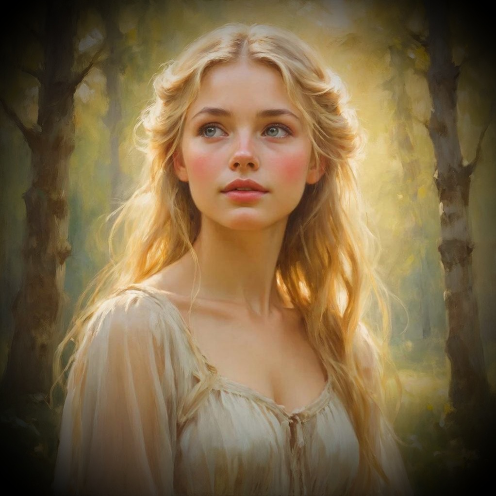 Тая шла сквозь Серебряный лес тихо, осторожно ступая по прохладному мху. Волосы её были цвета солнечного золота — длинные, густые пряди ниспадали каскадом, мерцая мягким светом даже ночью. Платье из тонкого льна нежно касалось кожи, словно утренний ветерок. Она знала эти тропинки, помнила каждый звук и шорох, каждое движение тени среди ветвей деревьев.