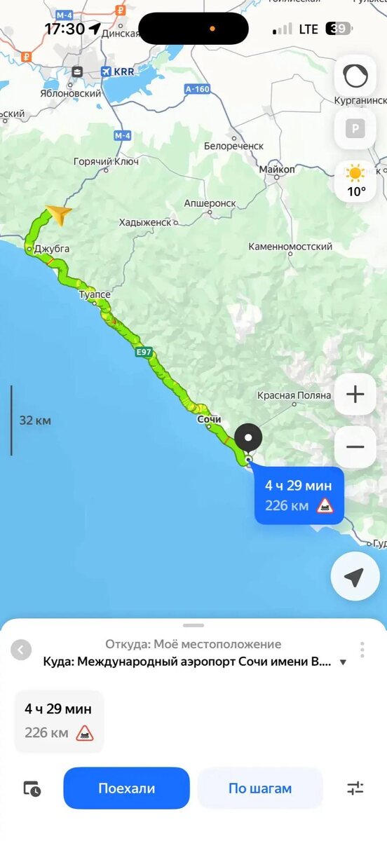 Поездами не успеваем никак, приедем только к 18-му числу. Остается 220 км серпантина до Сочи и надежда на ночной рейс. Навигатор оптимистично пишет 4,5 часа, но по этой дороге время — понятие растяжимое.