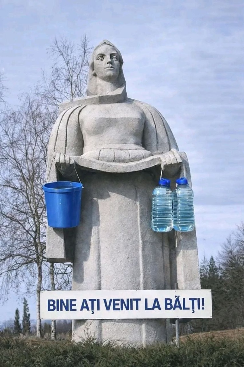 … Несмотря на кризис с водой и связанные с этим неудобства, жители северной столицы не растеряли чувства юмора. Смешно и грустно…🫣 📸На фото из соцсетей - знаменитая "тёща", скульптура, установленная на въезде в город @eNewsmd.online
