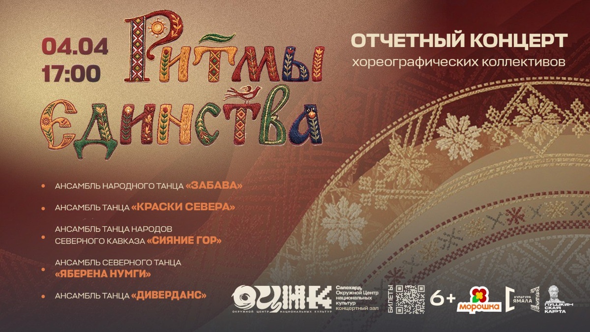 ✨ 4 апреля в 17:00 приглашаем вас на главное хореографическое событие весны — отчетный концерт «Ритмы единства». В программе — настоящий синтез времен: от аутентичных национальных танцев народов России до актуальных направлений современной хореографии. В этот вечер для вас выступят: 💫 Ансамбль народного танца «Забава» 💫 Ансамбль танца «Краски Севера» 💫 Ансамбль танца народов Северного Кавказа «Сияние гор» 💫 Ансамбль северного танца «Яберена Нумги» 💫 Ансамбля танца «Диверданс» Билеты доступны по ссылке: clck.ru/3SbXPQ по Пушкинской карте или через сервис «Морошка» со скидкой 20%