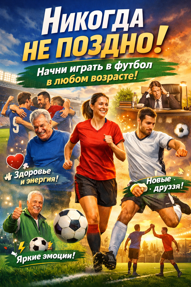 Что если тебе уже за 25, 30, 40… или даже 60 — «поезд ушёл»? ❌ Это самый опасный миф, который мешает тысячам людей начать жить активнее. 👉 Правда в том, что футбол — один из немногих видов спорта, в который можно войти в любом возрасте и получить от него максимум: здоровье, энергию, эмоции и даже новых друзей. И самое интересное — тебе не нужен идеальный старт. Нужен только первый шаг. Футбол кажется сложным: техника, скорость, тактика…