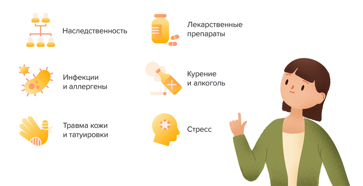Прежде всего, это генетическая предрасположенность. Если у кого-то в вашей семье был псориаз, то и у вас риск его развития повышается. Это не значит, что вы обязательно заболеете, но вероятность выше.