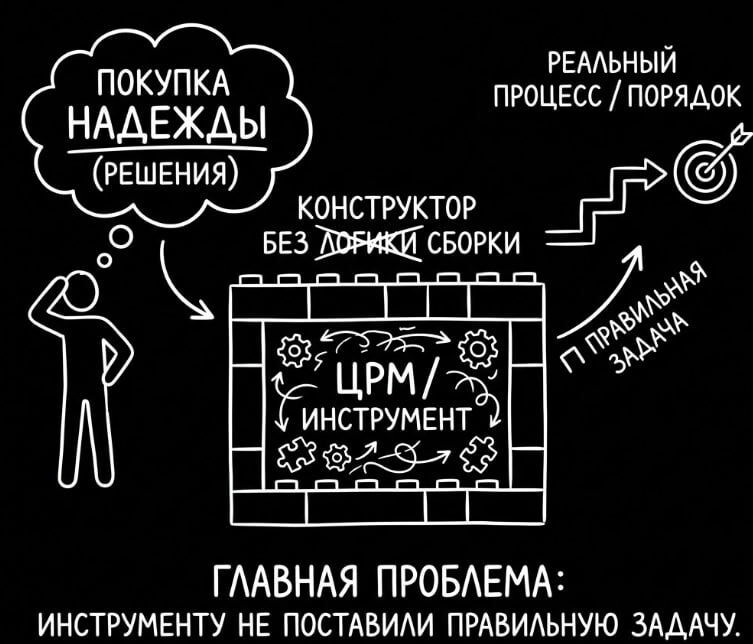 #управление #автоматизация #crm В какой-то момент я понял, что многие компании покупают не систему. Они покупают надежду 🆘 Надежду, что сам факт покупки CRM, платформы или нового инструмента уже наведет порядок. Надежду, что после оплаты тарифа менеджеры начнут работать лучше. Надежду, что руководитель начнет видеть картину. Надежду, Что продажи сами станут управляемыми. Но жизнь увы устроена жестче. Инструмент сам по себе не выстраивает процессы. Он только дает возможность это сделать. И вот здесь проходит очень важная граница. Когда компания покупает платформу, ей кажется, что она купила решение. Хотя на самом деле она купила конструктор. А конструктор без логики сборки легко превращается в новую форму хаоса. Поэтому первая взрослая мысль для руководителя звучит так. Проблема не в том, что у вас нет инструмента. Проблема в том, что инструменту никто не поставил правильную задачу. Именно поэтому на рынке так много "внедренных" систем, в которых никто не хочет работать. Н