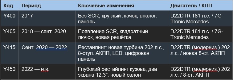 Y400 — единственная версия без системы нейтрализации выхлопа SCR (AdBlue). Двигатель соответствовал Евро 6 иными техническими средствами. Отсутствие SCR — главный аргумент в пользу этой версии при покупке.