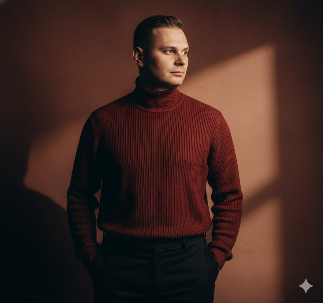 Давно не было мужских промптов для фотосессий, а я напоминаю что у нас целый раздел таких есть https://prompt1.ru/naznachenie/dlja-fotosessii-muzhchiny/ Создай фото. **Главное требование:** Перенести черты лица и внешность человека с загруженных фотографий — лицо должно быть точно сохранено, включая форму, пропорции и индивидуальные особенности. **Композиция:** Вертикальный кадр. Портрет от середины торса до головы. Субъект расположен слегка не по центру. Фон виден, но не доминирует из-за более плотного кадрирования. **Субъект:** Молодой мужчина стоит прямо, расслабленная осанка. Торс слегка повёрнут к камере, голова обращена в сторону источника света. Руки непринуждённо опущены в карманы брюк. Выражение лица — спокойное и уверенное. **Волосы:** Короткие волосы, аккуратно уложены с лёгким объёмом и чистой структурой. **Одежда:** Рифлёный свитер-водолазка насыщенного тёмно-красного тона. Посадка слегка свободная, с мягкими складками на ткани. Высокие тёмные брюки частично видны в к
