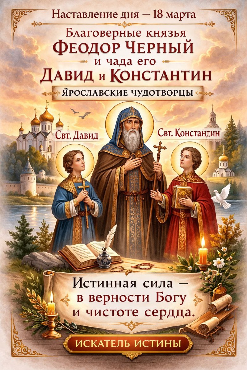 Благоверные князья Феодор Ростиславич Черный и чада его, Давид и Константин, Ярославские чудотворцы В этот день Церковь вспоминает благоверного князя Феодора Ростиславича, прозванного Черным, и его сыновей Давида и Константина — праведных правителей, которые сочетали земное служение с верностью Богу. Князь Феодор прошёл путь от мирской славы и воинских подвигов к глубокому покаянию и духовной жизни. Он научился видеть главное — не временную власть, а спасение души. Его сыновья, Давид и Константин, продолжили путь благочестия, стремясь жить по заповедям Божиим. Их жизнь была примером чистоты, послушания и любви к Богу. Эти святые показывают, что даже находясь во власти и среди мирских забот, человек может сохранить веру, смирение и стремление к праведной жизни. Память их напоминает нам: истинное благородство заключается не в происхождении или положении, а в чистоте сердца и верности Богу.