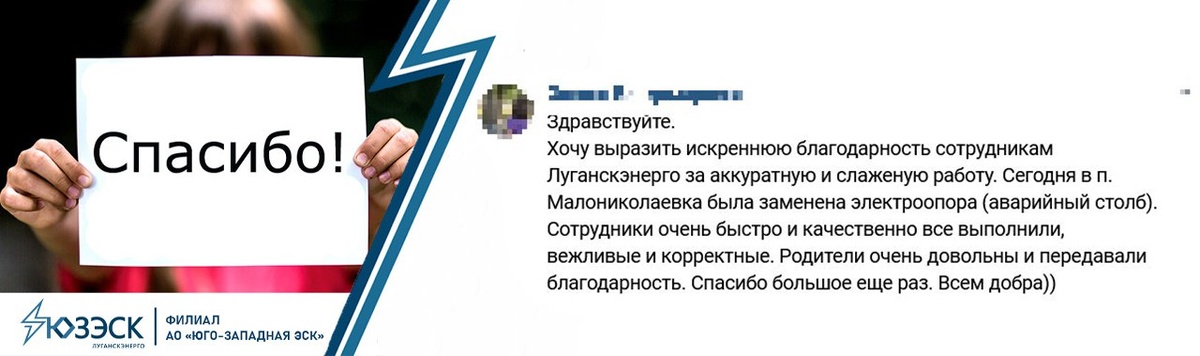 Специалисты Краснолучского РЭС «Луганскэнерго» филиала АО «Юго-Западная Электросетевая Компания» заменили опору по заявке пенсионеров из поселка Малониколаевка. Демонтировали деревянную стойку, которая уже находилась в аварийном состоянии, и установили на ее месте новую железобетонную. И как же приятно было получить в ответ от потребителя благодарность. Простое «спасибо» за свет, «за аккуратную и слаженную работу», «за корректность и качество»… Тот случай, когда теплые слова дороже всех наград. Спасибо тем, кто ценит и поддерживает энергетиков! Работаем, чтобы вам было светло!