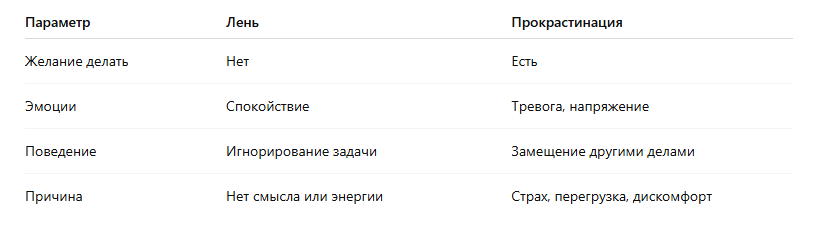 Лень и прокрастинация — это разные психологические состояния, при которых человек не приступает к задаче, но по разным причинам и с разными внутренними ощущениями. На первый взгляд они похожи: задача не выполняется, дедлайн приближается, результат отсутствует. Но если не различать эти состояния, легко выбрать неэффективную стратегию: пытаться «заставить себя» там, где нужен отдых, или, наоборот, отдыхать, когда дело в тревоге и избегании. Разберёмся, как отличить лень от прокрастинации и что с этим делать. Представим типичную ситуацию: вам нужно обновить портфолио. Вы смотрите на задачу и думаете: «Заказы есть, доход стабильный — можно не спешить». Нет внутреннего конфликта, нет чувства вины. Просто нет желания тратить ресурсы. Это лень. Вы понимаете, что портфолио важно: хотите поднять чек, привлечь новых клиентов. Даже открываете файл, начинаете работу — и тут же переключаетесь на почту, кофе или бытовые мелочи. Это прокрастинация. Ключевое различие: Можно свести разницу в таблицу: