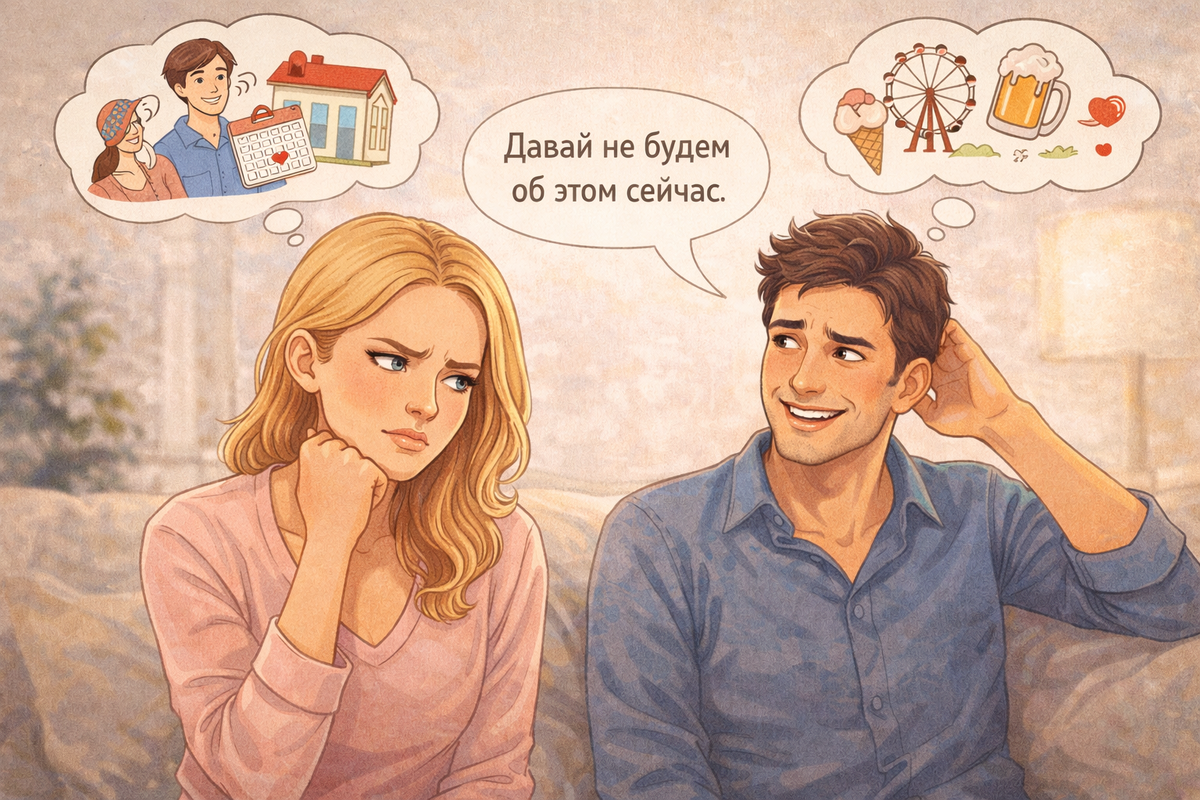 Когда разговор заходит о будущем или серьёзности отношений, мужчина начинает уходить от темы. Он может шутить, переводить разговор или говорить, что ещё рано об этом думать. Это вызывает непонимание. Женщина начинает думать, что мужчина не воспринимает отношения серьёзно. Но чаще всего причины такого поведения глубже и не всегда очевидны. Даже если отношения идут хорошо, это не значит, что человек готов к серьёзным шагам. Для кого-то разговоры о будущем — это уже большая ответственность. Мужчина может просто не чувствовать готовности двигаться дальше. Плюсы Минусы Иногда мужчине комфортно в текущем формате отношений. Ему нравится, как всё складывается сейчас. И он может бояться, что серьёзные разговоры изменят атмосферу. Плюсы Минусы Прошлые отношения могут сильно влиять на поведение. Если человек сталкивалс