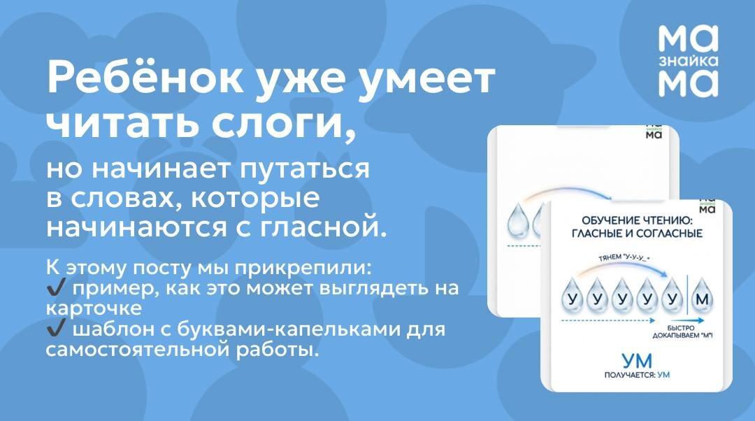 Например: ум, ёж, юг, ель. Вместо того чтобы начать чтение с первой буквы, ребёнок как будто по привычке пытается добавить впереди согласную. И тогда вместо «ум» получается «му». Почему так происходит? 🤔 Чаще всего ребёнок просто уже привык читать слоги, где сначала идёт согласная, а потом гласная. Поэтому мозг автоматически пытается построить знакомую схему чтения. В такой ситуации хорошо помогает простой и наглядный приём — буквы-капельки 💧 Можно показать ребёнку, что если впереди нет согласной, то перед нами не привычная «лодочка», а отдельные капельки-буквы. А дальше подключаем простое правило: длинные тянутся, короткие быстро капают. Тогда слово читается так: УУУУУм ЁЁЁЁж То есть ребёнок тянет первую капельку, а потом быстро докапывает вторую. Ещё один приём, который хорошо помогает в таких случаях, — «шторка». Мы закрываем часть слова карточкой и открываем буквы постепенно, по мере чтения. Ребёнок видит только ту букву, которую читает сейчас, и не перескакивает глазами вперёд.