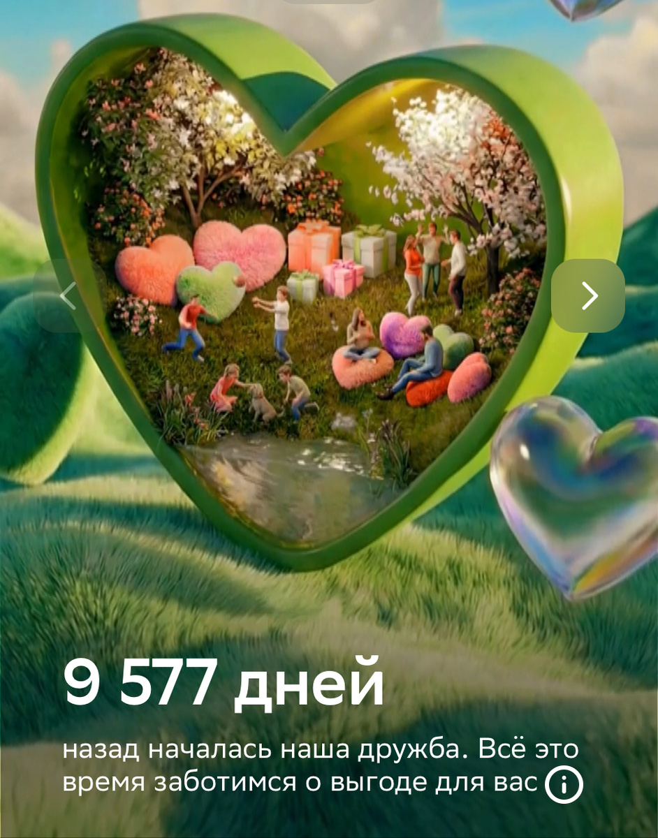 Сбер по случаю Дня клиента напомнил сколько дней мы вместе Оказалось, что я клиент Сбера уже 9577 дней (>26 лет). На самом деле - дольше, но, видимо, более ранние данные по каким-то причинам не учли. А как давно вы со Сбером и какой ваш основной банк? #SBER