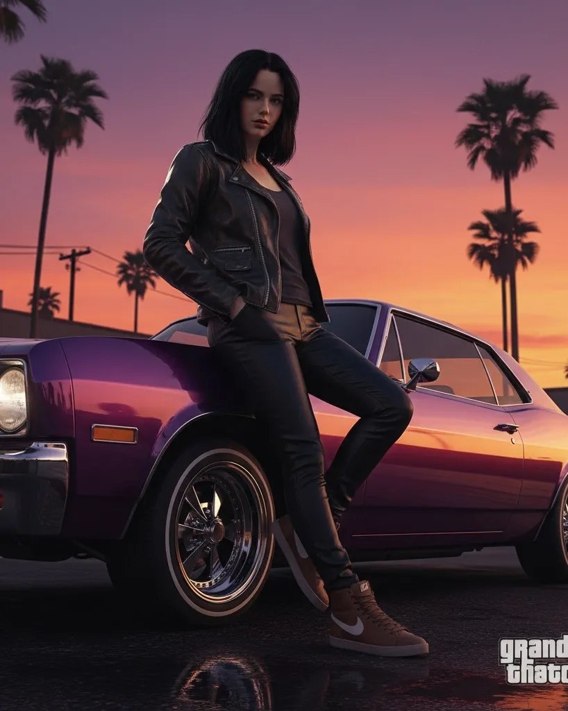 Загрузи свое фото и получи такое же изображение, на котором будешь ты. ✨ Создать фото через сайт ✨ ✨ Создать фото в телеграм боте ✨ Промпт для фото: **Стиль / Сеттинг** Персонаж в эстетике видеоигры Grand Theft Auto V. Стилизованный гиперреализм, рендер на игровом движке. **Поза и окружение** Человек в образе гангстера небрежно опирается на блестящий лоурайдер с хромированными дисками. Одна нога скрещена поверх другой. Серьёзное, уверенное выражение лица — гангстерская харизма. **Одежда** Чёрные кожаные штаны. Коричневые кроссовки Nike Blazer Hi. **Фон и освещение** Яркий городской закат — силуэты пальм на оранжево-фиолетовом небе. Драматичное кинематографичное освещение. Гиперреалистичные отражения на машине и... Все промты для ИИ на нашем сайте и в телеграм канале #город #закат #кинематографичный #автомобиль #женщина