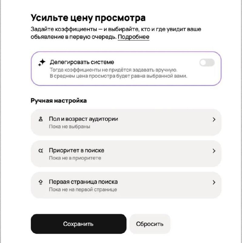 А теперь рассказываю подробнее, что это такое. Это - пустышка😅 Очередное исследование пользовательского интереса от Авито. Но если вы заметили этот «функционал» у себя в аккаунте, попробуйте его «протестировать». Так Авито поймёт, что интерес есть и будут его раскатывать. А я объясню, почему это должно быть всем интересно. Сейчас вы можете поставить одну ставку на объявление и платите одинаково, что за просмотр из «рекомендаций», что за просмотр из «топа», что за просмотр объявления на 10 странице по низкочастотному запросу. Опытные предприниматели и маркетологи должны понимать, что качество таких кликов отличается. Приведу пример: - предположим, что минимальная цена просмотра на услуги Авитилога в СПб - 44 рубля - чтобы попасть в топ и стабильно получать заявки, вы поднимаете ставку условно до 200р - авито показывает вас в рекомендациях и вы начинаете получать десятки просмотров в день, тратить 5-10к на одно объявление - в итоге, получаете высокую стоимость заявки, так как целевы