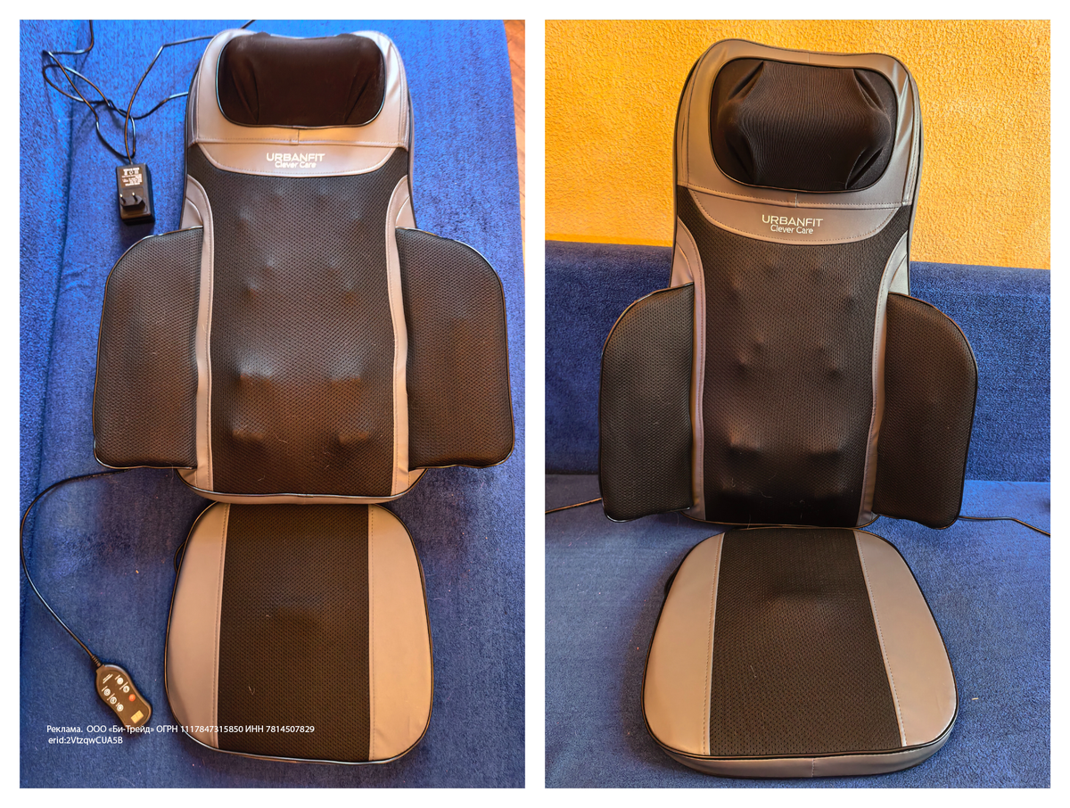 Массажная накидка, которая полностью берет на себя функции целого массажного кресла. Я вам сначала сфотографировала ее лежа, а потом установив, как кресло, прямо на диване. Я, к слову, и так, и так, пробовала. Т.е. попробовала на нее лечь. если подобрать режим - райское наслаждение! Но ощущения, когда сидишь, мне нравятся еще больше.