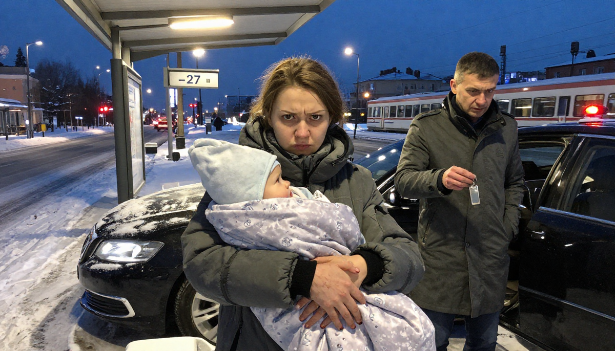 Было минус двадцать семь. Январь, шесть вечера, остановка на Привокзальной. Автобус не ходил уже сорок минут. Я стояла под навесом, прижимала дочку к себе и считала. Не деньги — у меня их не было. Считала время. Если автобус не придёт в ближайшие пятнадцать минут, нужно идти обратно в торговый центр. Там охранник — Валера, пожилой, с усами. Он пускал меня погреться до девяти. После девяти — выгонял. Не со зла, а потому что начальство.