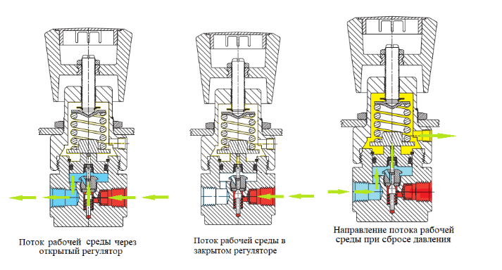 При открытии системы в ней появляется поток рабочей среды, в том числе и через регулятор давления. Когда он проходит через клапан регулятора, создается небольшое падение давления в полости регулятора на выходе.