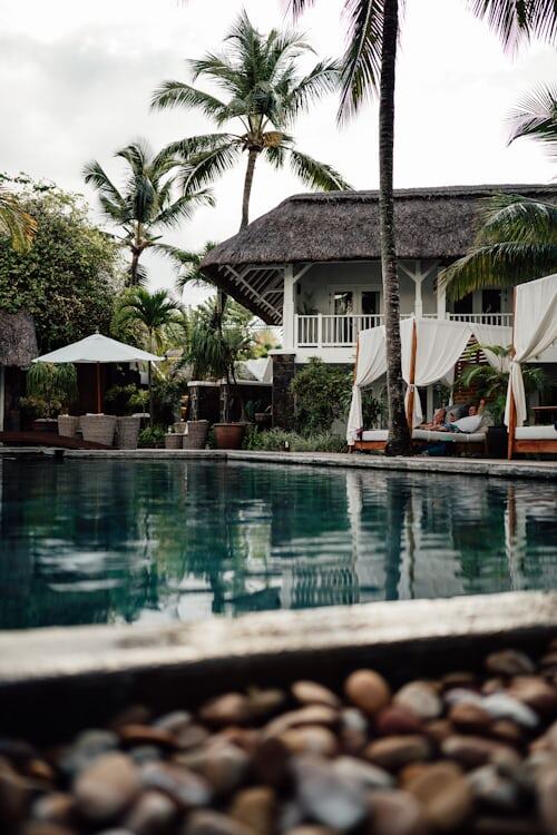 Крыша из тростника — алангаланга или рисовой соломы — уложена вручную, слой за слоем, как это делали на этих островах тысячу лет назад. Бассейн обрамлён речной галькой — каждый камень округлён водой за десятилетия. Белые газовые шторы на кабанах колышутся без ветра — просто так, сами по себе. Двое людей лежат у воды, и по их позам видно: они никуда не торопятся.