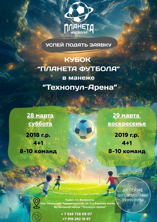 ! Мы знаем, вы ждали — мы возвращаем однодневные турниры Балашихе! Это отличная возможность для ребят проявить себя и получить незабываемые впечатления от соревнований на газоне отличного качества! Собирайте команду и регистрируйтесь! Возрастные категории: 2018, 2019 г. р. Футбольный манеж «Технопул‑Арена», Московская область, городской округ Балашиха, мкр. Никольско‑Архангельский, ул. 7‑я Верхняя Линия, 13 Количество мест до 8–10 команд в каждой возрастной группе МЫ ПРЕДЛАГАЕМ: непредвзятое и независимое судейство; до 10 команд‑участников; игровое время — 17–20 минут/матч; диктор на играх; фотоотчёт; крутое медиасопровождение; медицинский персонал на месте; награждение всех участников соревнований; награждение лучших игроков матча; индивидуальные награды для игроков каждой команды. ФОРМАТ: 4+1 ПОДАЙ ЗАЯВКУ СЕЙЧАС — МЕСТА ОГРАНИЧЕНЫ! Контакты для регистрации: +7 (926) 728‑08‑07 Алексей +7 (916) 262‑19‑97 Олег Следите за новостями: Telegram: t.me/footballpl... ВКонтакте: vk.