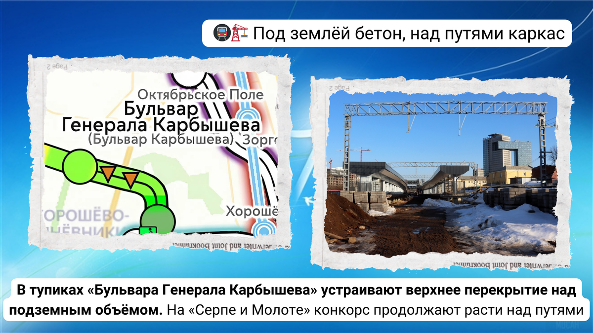 официальные отчеты. Давайте вместе разберемся, что же на самом деле происходит с нашей Москвой. Поехали? В западной части котлована (оборотные тупики) 🚇«Бульвар Генерала Карбышева» 💸Рублёво-Архангельской линии ведутся работы по устройству верхнего перекрытия. Над станцией продолжается возведение венткиосков. Во второй части представим обзор 🚊 станции «Серп и Молот» МЦД-2, МЦД-4. Весь обзор: https://rajon-pride.livejournal.com/341724.html ---------------------------------------------------