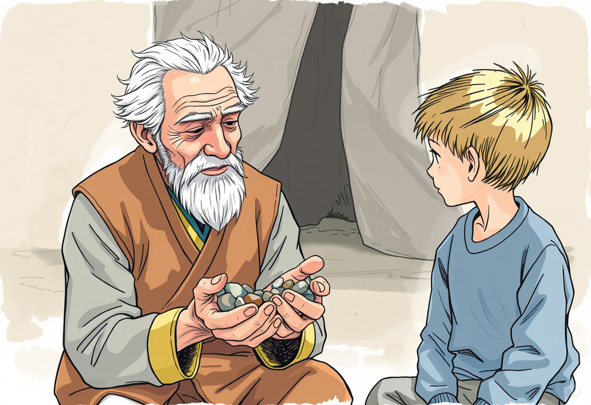 - Это же камни. - А ты подержи в ладони, - сказал старик. Мальчик взял один камешек. Он был тёплым от руки старика. И вдруг ему показалось, что от него идёт свет. Не яркий, а т