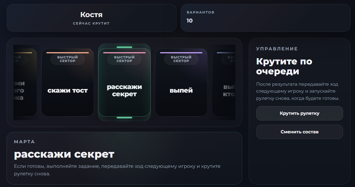 1. Барная рулетка - для шумной компании и домашних вечеринок на есть «Алкогольная рулетка». В неё можно добавить свои варианты, задания, тосты и имена игроков, а затем крутить колесо по кругу. Алкогольная рулетка онлайн подходит для компании друзей, дня рождения и любого вечера, где хочется добавить случайность и весёлые испытания. 2. Элиас - если вы хотите Элиас играть в компании, есть отдельная страница игры «Элиас». Игрок получает слово, объясняет его команде и передаёт ход следующему участнику - проще некуда Такой режим подходит для вечеринок, домашних посиделок, семейных встреч и быстрых онлайн-раундов. Элиас онлайн удобно запускать без скачивания и без долгой подготовки. 3. Кто я? - ещё один бесплатный режим — играть в «Кто я?». Игроку показывается персонаж, которого он дол
