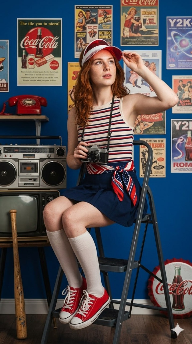 Спокойной ночи. Используй загруженное селфи как основу. Черты лица, пропорции и внешность должны быть перенесены с фото максимально точно — без каких-либо изменений. **Образ и поза** Персонаж сидит на тёмно-серой стремянке. Взгляд задумчиво направлен вверх. Правая рука держится за козырёк визора, левая рука держит винтажную камеру. **Одежда и аксессуары** Полосатый топ без рукавов: молочно-белый, красный, тёмно-синий. Тёмно-синяя плиссированная мини-юбка. Гольфы молочно-белого цвета до колена. Красные кроссовки. Красно-бело-синяя бандана на талии. Полупрозрачный красный козырёк на голове. **Фон и реквизит** Стена насыщенного королевского синего цвета с винтажными постерами (Coca-Cola и др.). Красный дисковый телефон, бумбокс, старый телевизор. На полу слева — деревянная бейсбольная бита, справа — большая крышка от бутылки Coca-Cola. **Стиль и атмосфера** Мягкое равномерное освещение. Кинематографичная ретро-эстетика в духе Y2K. Ультрареалистичная фотография. **Технические парамет