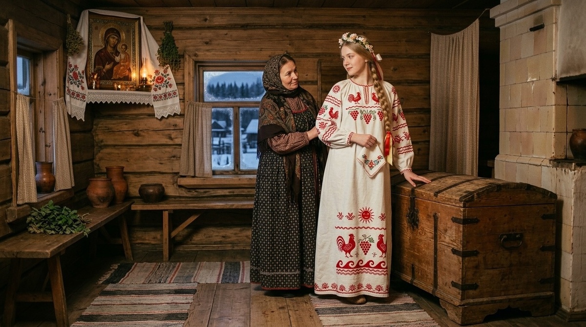 Мария разложила платье на лавке, разгладила складки ладонями. В горнице пахло мятою и ещё чем-то старым, древесным. Сундук стоял в углу, окованный медью, с тяжёлой крышкой, которую Анфиса в детстве не могла поднять.