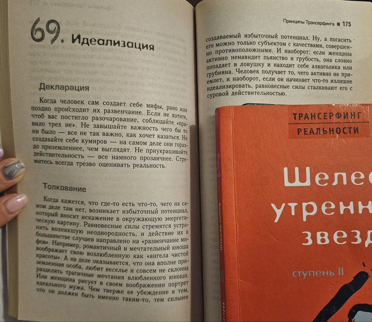 69/78 Практикум управления реальностью - Трансерфинг Идеализация "Когда человек создает себе мифы, рано или поздно происходит их развенчание. Если не хотите, чтобы вас постигло разочарование, соблюдайте "правило трех не". Не завышайте важность чего бы то ни было - все не так важно, как хочет казаться. Не создавайте себе кумиров - на самом деле они гораздо приземленнее, чем выглядят. Не приукрашивайте действительность - все намного прозаичнее. Стремитесь всегда трезво оценивать реальность." "Например, женщина рисует в своём воображении портрет идеального мужа. Чем тверже ее убеждение в том, что он должен быть имено таким-то, тем сильнее создаваемый избыточный потенциал. Ну, а погасить его можно только субъектом с качествами, совершенно противоположными. И наборот, если женщина активно ненавидит пьянство и грубость, она словно попадает в ловушку и находит себе алкоголика или грубияна. Человек получает то, чего активно не приемлет, и наоборот, если он начинает что-то излишне идеализир