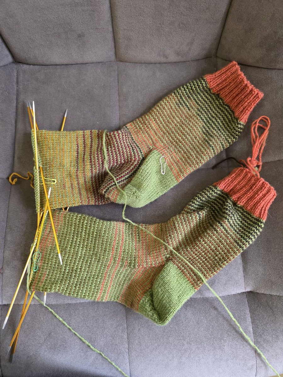 Ещё одна пара носочков из остатков почти готова. Расцветка получилась больше осенняя, зато мне нравится. И остатки поубавились.