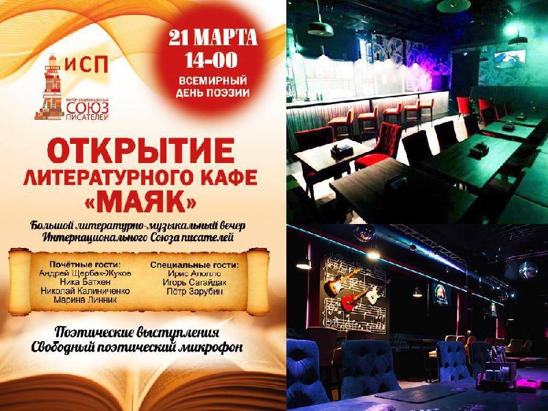 ! Друзья Московского городского отделения ЛДПР из Интернационального Союза писателей приглашают на открытие литературного кафе «Маяк». 21 марта, во Всемирный день поэзии, новое пространство для писателей и поэтов распахнет свои двери. 🗓 21 марта 📍 Москва, ул. Бутырская, 75 м. Дмитровская 🕑 Сбор гостей с 13:45, начало в 14:00 Окончание в 18:00 👉 Предварительная регистрация гостей на мероприятие обязательна: https://inter-union-writers.timepad.ru/event/3873526/ ⚡ Поэтам: для участия в свободном микрофоне выберите билет «Открытый микрофон». Предварительная регистрация обязательна. Количество выступающих ограничено! https://inter-union-writers.timepad.ru/event/3873526/ Литературное кафе «Маяк» продолжает старую русскую традицию творческих пространств, где литература живёт не только на страницах книг, но и в живом диалоге авторов. Эта традиция восходит к знаменитой кофейне Вольфа и Беранже в Санкт-Петербурге. Здесь собирались Пушкин, Лермонтов, Достоевский, Панаев и многие другие