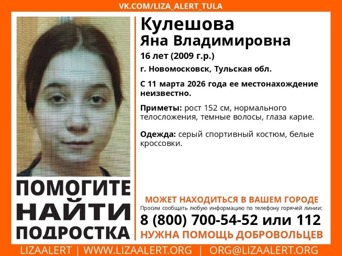 Региональное отделение поисково-спасательного добровольческого отряда "ЛизаАлерт" присоединилось к поискам 16-летней Яны Кулешовой из тульского Новомосковска. Пропавшая еще 11 марта девушка может, в том числе, находиться в Калужской области. Видевших ее просят звонить по телефонам 8 926 009 31 93, 8 800 700 54 52 или 112.