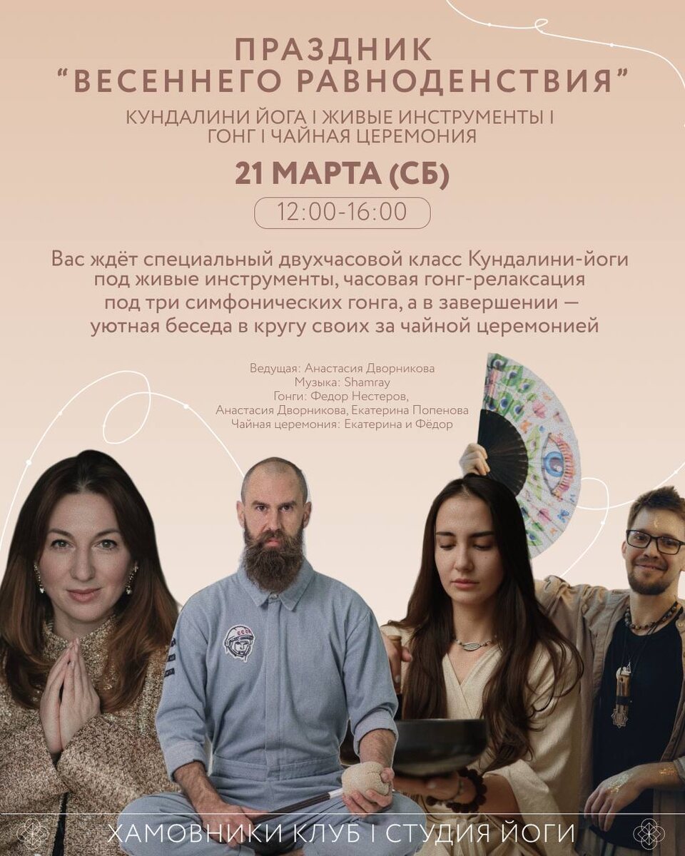 ! Праздник весеннего равноденствия🌸 Суббота, 21 Марта | 12:00-16:00 Двухчасовой класс Кундалини йоги под живые инструменты, часовая гонг-релаксация под три симфонических гонга, а завершении — уютная беседа среди своих за чайной церемонией 🤍 Ведущая: Анастасия Дворникова. Музыка: Shamray Гонги: Федор Нестеров, Анастасия Дворникова, Екатерина Попенова. Чайная церемония: Екатерина и Фёдор. 🔗Записаться