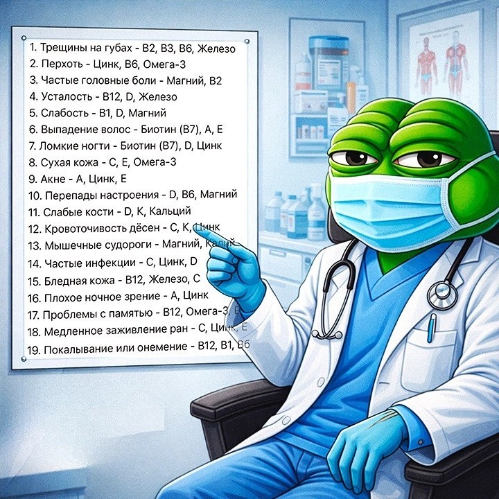 1. Трещины на губах — B2, B3, B6, Железо; 2. Перхоть — Цинк, B6, Омега-3; 3. Частые головные боли — Магний, B2; 4. Усталость — B12, D, Железо; 5. Слабость — B1, D, Магний; 6. Выпадение волос — Биотин (B7), A, E; 7. Ломкие ногти — Биотин (B7), D, Цинк; 8. Сухая кожа — C, E, Омега-3; 9. Акне — A, Цинк, E; 10. Перепады настроения — D, B6, Магний; 11. Слабые кости — D, K, Кальций; 12. Кровоточивость дёсен — C, K, Цинк; 13. Мышечные судороги — Магний, Калий; 14. Частые инфекции — C, Цинк, D; 15. Бледная кожа — B12, Железо, C; 16. Плохое ночное зрение — A, Цинк; 17. Проблемы с памятью — B12, Омега-3, E; 18. Медленное заживление ран — C, Цинк, E; 19. Покалывание или онемение — B12, B1, B6. Главное: не превышайте рекомендованную дозу; проверьте, нет ли у вас противопоказаний; не сочетайте с другими витаминны Показать полностью... Шарья – столица мира Крупнейшее городское СМИ Источник: Открыть