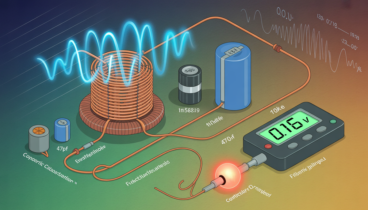 1. Припаяйте керамический конденсатор (47 пФ) непосредственно к выводам катушки — это критично для резонанса.