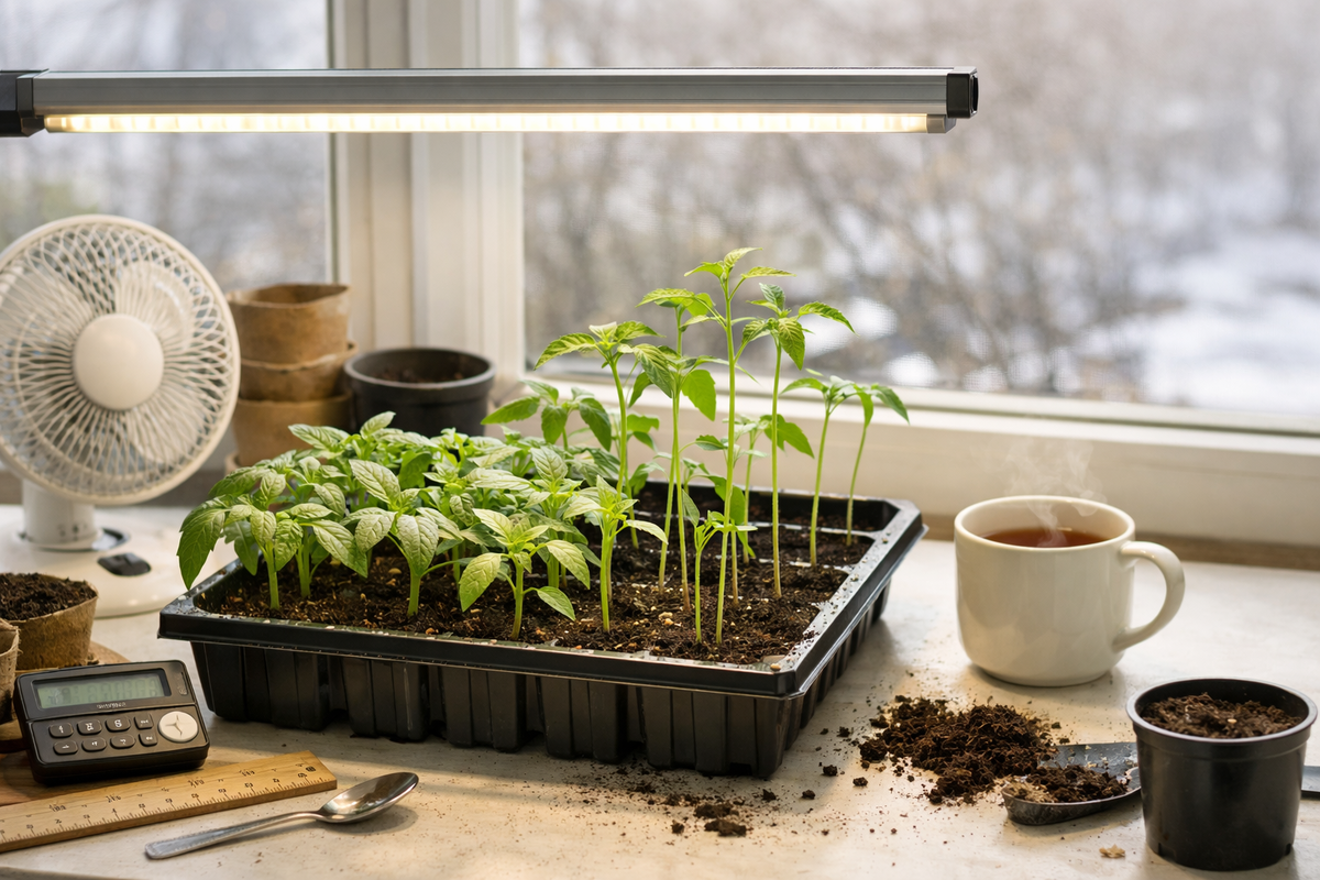 Когда рассада стоит плотной толпой, начинается борьба за свет. А где борьба — там и вытягивание. Немного воздуха между растениями часто даёт больше пользы, чем ещё одна лампа «на всякий случай». Хорошая вентиляция и расстояние между сеянцами помогают и от лишней сырости.
