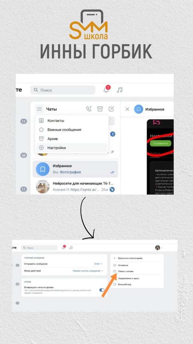 !) 1️⃣Переходим в раздел мессенджер 2️⃣Нажимаем на три полосочки➡️настройки 3️⃣Нажимаем папки с чатами 4️⃣Нажимаем добавить папку 5️⃣Пишем название папки и выбираем чаты, которые мы туда добавим Готово! По такому же алгоритму, можно папки удалить Было полезно?😸 〰️〰️〰️〰️〰️〰️〰️ 📱Мы в ВКонтакте 📱Мы в МАХ 💬Подписывайтесь, дорогие, чтобы оставаться на связи!