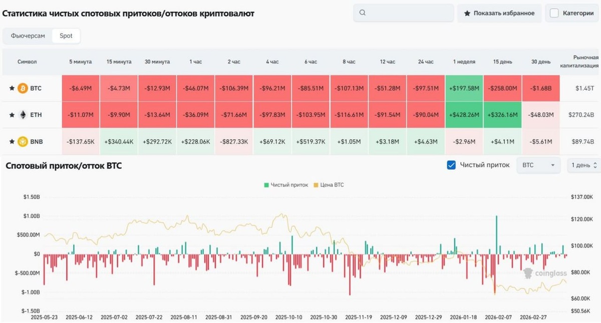 Рынок подаёт сигналы восстановления — цены растут, паника уходит, а крупные деньги снова заходят. Но главный вопрос остаётся: это начало нового тренда или просто отскок перед следующим снижением? 🤔 С одной стороны, картина выглядит всё более конструктивно. Уже неделю подряд фиксируются стабильные притоки в ETF — суммарно свыше $1 млрд. Такие деньги редко заходят «на эмоциях», чаще это постепенное формирование позиций крупными игроками. Именно такие процессы обычно лежат в основе разворотов. ☝️С другой стороны, рынок пока не выглядит по-настоящему сильным. Да, цена удерживается выше недавних уровней, а перевес покупателей наконец появился. Но ликвидности всё ещё не хватает — любое движение может оказаться нестабильным. 📊 Фундамент тоже постепенно улучшается. Регуляторы в США начали вносить ясность в правила игры, а это снижает один из ключевых рисков для крупных инвесторов. Плюс расширяется инфраструктура — всё больше инструментов для институционалов. Но главный фактор сегодня — это н