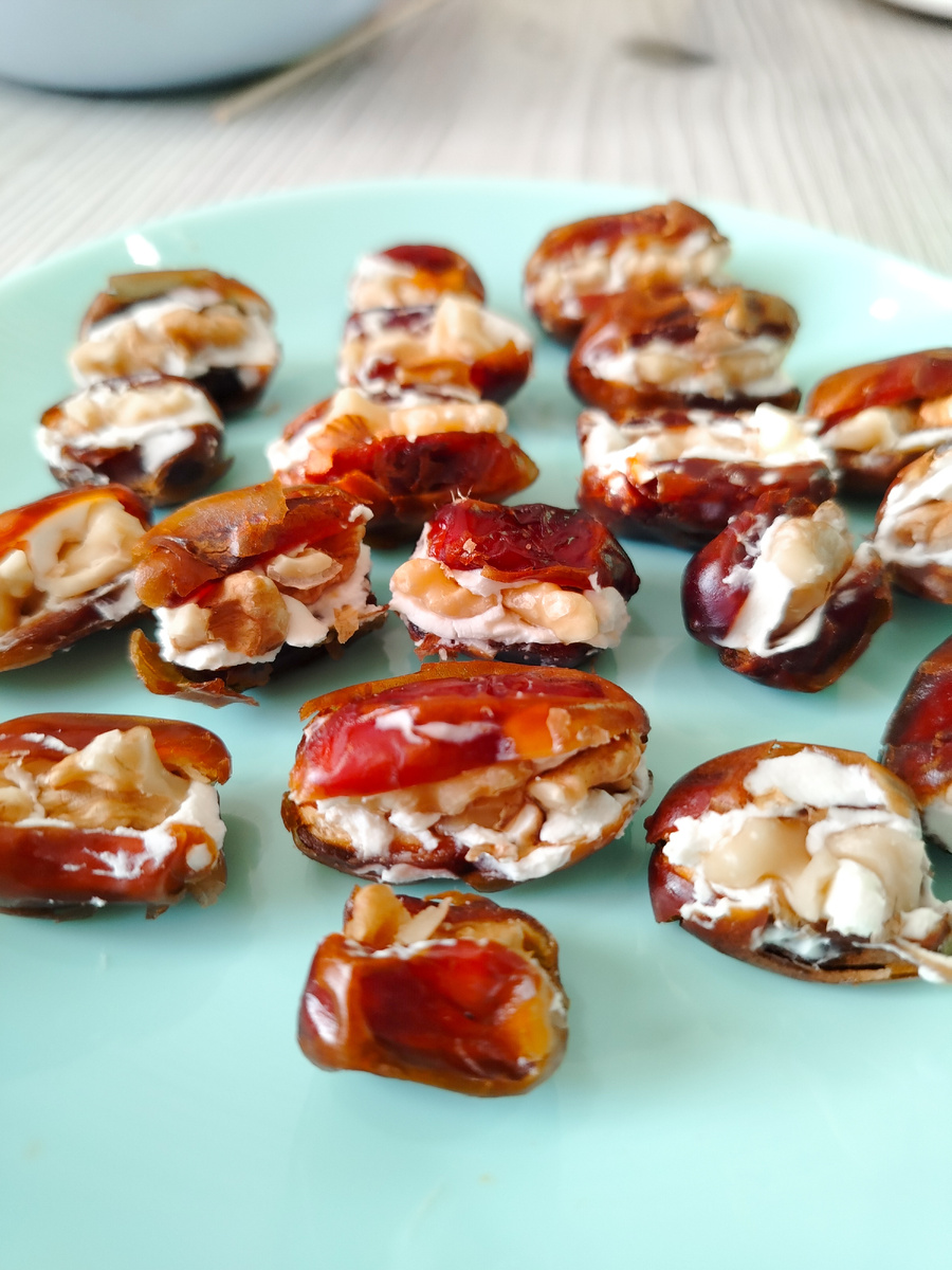 Сочетание сладости фиников, нежности творожного сыра и лёгкой горчинки орехов создаёт гармоничный вкус. Блюдо сочетает углеводы, белки и полезные жиры, что делает его сытным и полезным перекусом.