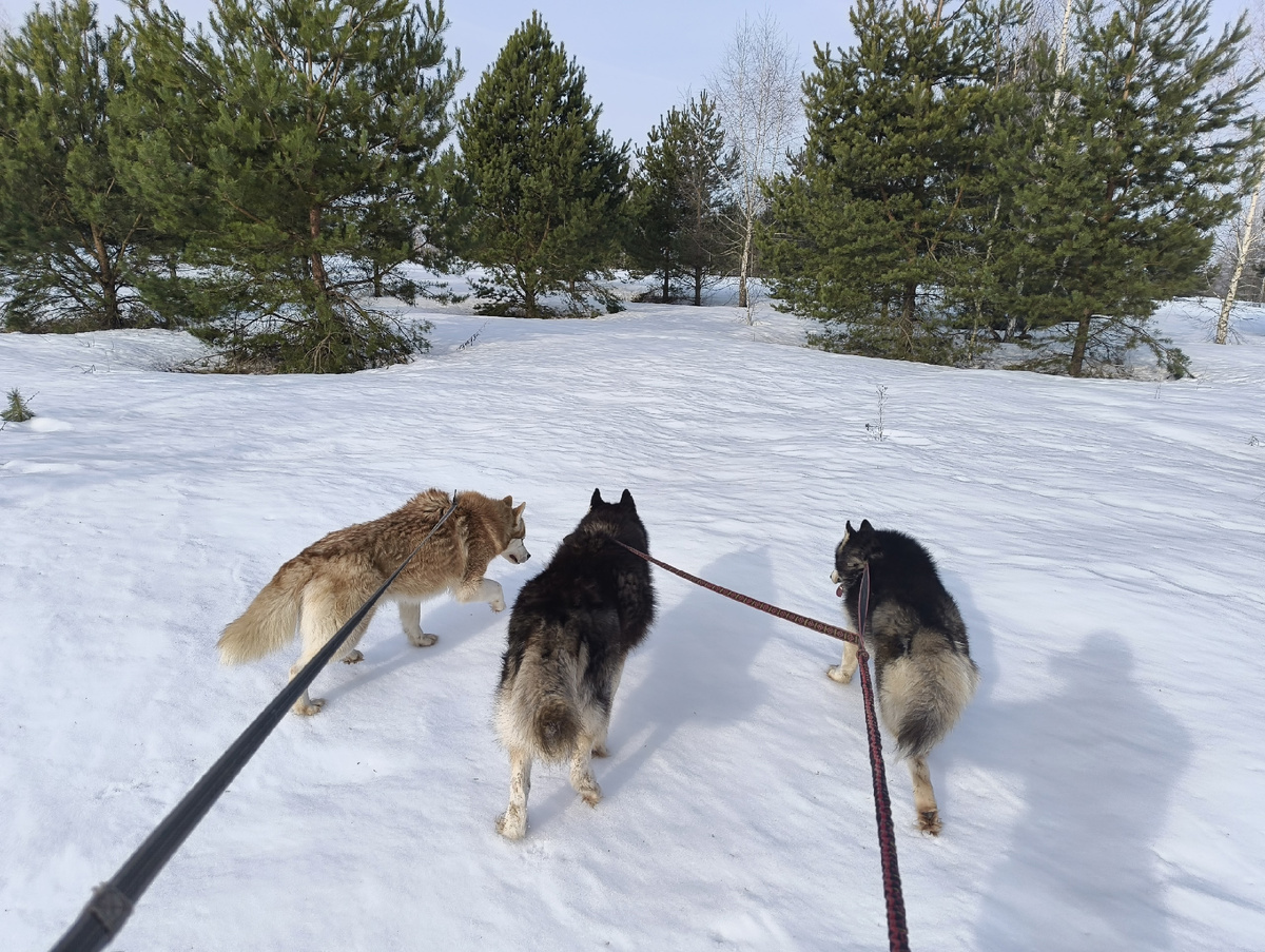 Сегодня я отправилась провожать Ваню с собаками на поводках – с Герой, Багги и Пиратом. Рыжий хаски был ограничен в свободе, так как нам предстояло идти рядом с дорогой, а сам не свой до мащин: при виде движущегося автомобиля разум собаки затуманивается, и Багги несется за ним через все поле. Пирата я хоть и приучила гулять без поводка и не убегать, но воспринимать гусей как еду он так и не перестал, а закрывать только вышедших из своего домика птиц мне не хотелось. Наконец, Гера, которая и пернатыми закусить не прочь, и время от времени свалить в туман, не согласовав предварительно это сваливание со мной. В ее защиту должна сказать, что с Герой я так и не начала прицельно и долго, методично, как с Пиратом, работать на не-сбегание от нас на прогулке. С прежним хозяином она тоже так себя вела, и, думаю, у нее это просто уже вошло в привычку и встроилось в нормальную картинку мира. Гулять с собаками на поводках я не люблю совсем (и сегодня в очередной раз в этом убедилась, хотя не то что
