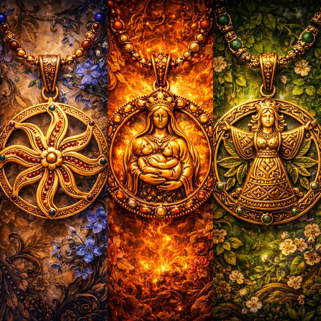 Золото может быть уместно там, где нужен уже утверждённый, торжественный образ женской силы — зрелой, солнечной, богатой, хозяйственной. Но если речь идёт об амулете как хранителе, серебро почти всегда оказывается глубже.