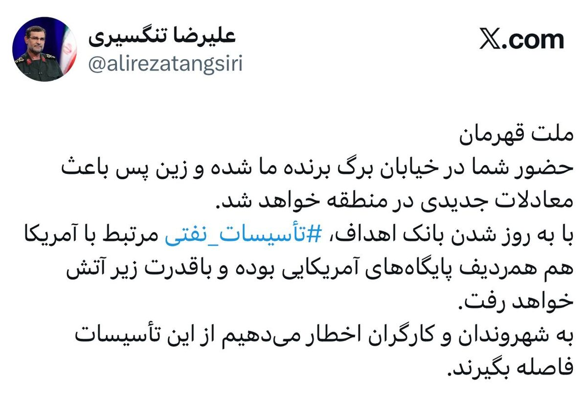 🇮🇷🇺🇸 Командующий ВМС КСИР Алиреза Тангсири сообщил, что отныне нефтяные объекты США в одном ряду с военными базами.