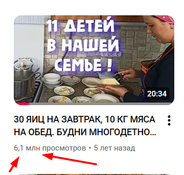Но вернусь, пожалуй, на пять лет назад, к тому самому ролику: «30 ЯИЦ НА ЗАВТРАК, 10 КГ МЯСА НА ОБЕД. БУДНИ МНОГОДЕТНОЙ МАМЫ С 11 ДЕТЬМИ И БОЛЬШИМ ХОЗЯЙСТВОМ!» Сейчас этот ролик так и находится в ТОПе моих роликов на «Ютубе». За пять лет его посмотрело уже 6 000 000 — шесть миллионов человек!