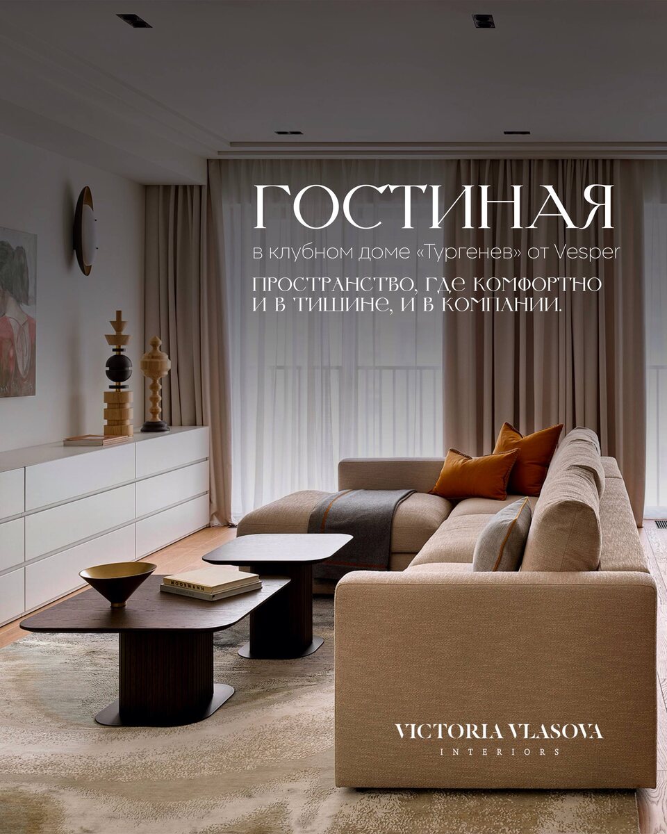 Здесь важно было создать атмосферу, в которой одинаково комфортно проводить тихие вечера и встречать гостей. Центральное место занимает диванная группа — она формирует зону отдыха и задаёт композицию всей комнаты. Мягкие формы мебели, натуральные материалы и сложные фактуры создают спокойную, благородную палитру. Текстиль добавляет глубину, а авторский декор и арт-объекты становятся деликатными акцентами, которые делают интерьер индивидуальным. Свет здесь работает как отдельный сценарий: мягкая подсветка, акцентные светильники и декоративный свет позволяют менять атмосферу пространства в течение дня. Именно в таких деталях и рождается ощущение дома — продуманного, гармоничного и по-настоящему личного. ✨ ⁃ Диван , комод - по индивидуальному заказу ⁃ Подушки: ENERE ⁃ Кресло: DAYDREAMER ⁃ Ковер: Hasan Modern ⁃ Картина To Go, жикле , автор – Дмитрий Шорин ⁃ Чаша Taper by Colin King ⁃ изделия Tado Sculpture и Pure Wood Sculpture by Liza Kornilova Дизайн интерьера Victoria Vlasova Inter
