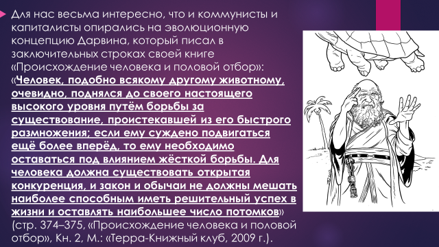 u Коротая долгие зимние вечера перед телевизором, и наблюдая как одна сильная в технологическом отношении страна бомбит другую, менее развитую в технологическом отношении страну, было бы интересно посмотреть, в каком обществе мы живем. Ну, гримасы капитализма, скажет скептик, - что вы хотите? u Казалось бы, человечество весь 20 век только и делало, что выбирало между социализмом и капитализмом. Но похоже, так и не пришло к какому-то окончательному решению. Какой строй является наилучшим? Кто ошибся в своих прогнозах: приверженцы коммунизма или капитализма? u Для нас весьма интересно, что и коммунисты и капиталисты опирались на эволюционную концепцию Дарвина, который писал в заключительных строках своей книге «Происхождение человека и половой отбор»: «Человек, подобно всякому другому животному, очевидно, поднялся до своего настоящего высокого уровня путём борьбы за существование, проистекавшей из его быстрого размножения; если ему суждено подвигаться ещё более вперёд, то ему необходимо