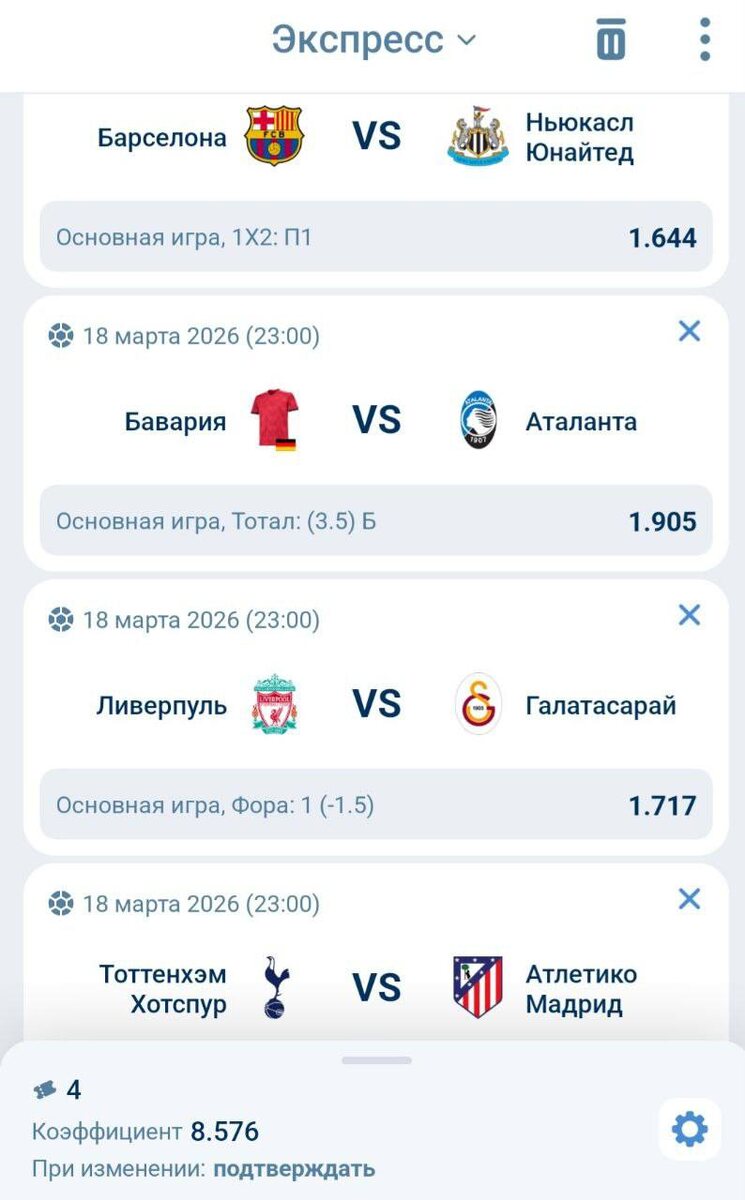 Дисклеймер: Ненормативная лексика. 18 +. Не является ИИР. Рублика #ЛудкасGrokодой Лига Чемпионов UЕFА. 1/8 финала. Ответные матчи Барселона - Ньюкасл П1 за 1.64 Обоснование: 1-1 после первой игры + дома Барса с Ямалом и без травм в атаке доминирует. Бавария - Аталанта ТБ 3.5 за 1.9 Обоснование: 6-1 после первой игры — матч уже «пройден». Обе команды сыграют без давления, ждем голевую феерию. Ливерпуль - Галатасарай Ливерпуль -1.5 (азиатская фора) за 1.7 Обоснование: При 0-1 после первой игры - Ливерпуль дома обязан рвать, Галата не удержит давление. Тотенхэм - Атлетико Мадрид ×2 Атлетико не проиграет за 1.59 Обоснование: 2-5 после первой игры — Тоттенхэм в кризисе, Атлетико Симеоне просто не даст перевернуть. Все матчи в экспресс за 8.57. Это просто мои вероятностные прогнозы по модели бери или пропускай на свой страх. Азартные игры - ЭТО риск. Ставь только ТО, что можешь позволить себе потерять. Grok (с) Джин Аладин @sosisochnayagazeta