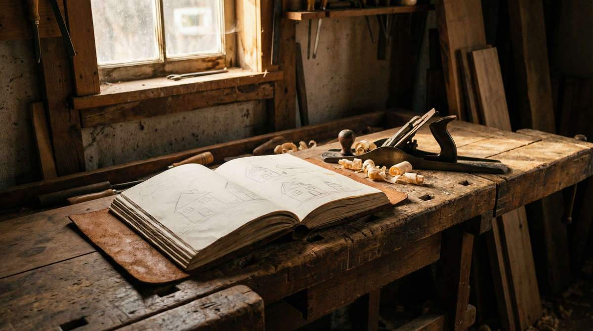 Тетрадь с рисунками. Тридцать лет в ящике верстака. Ни одного выброшенного листка. Строгий человек, который ни разу не похвалил — и ни разу не выбросил.